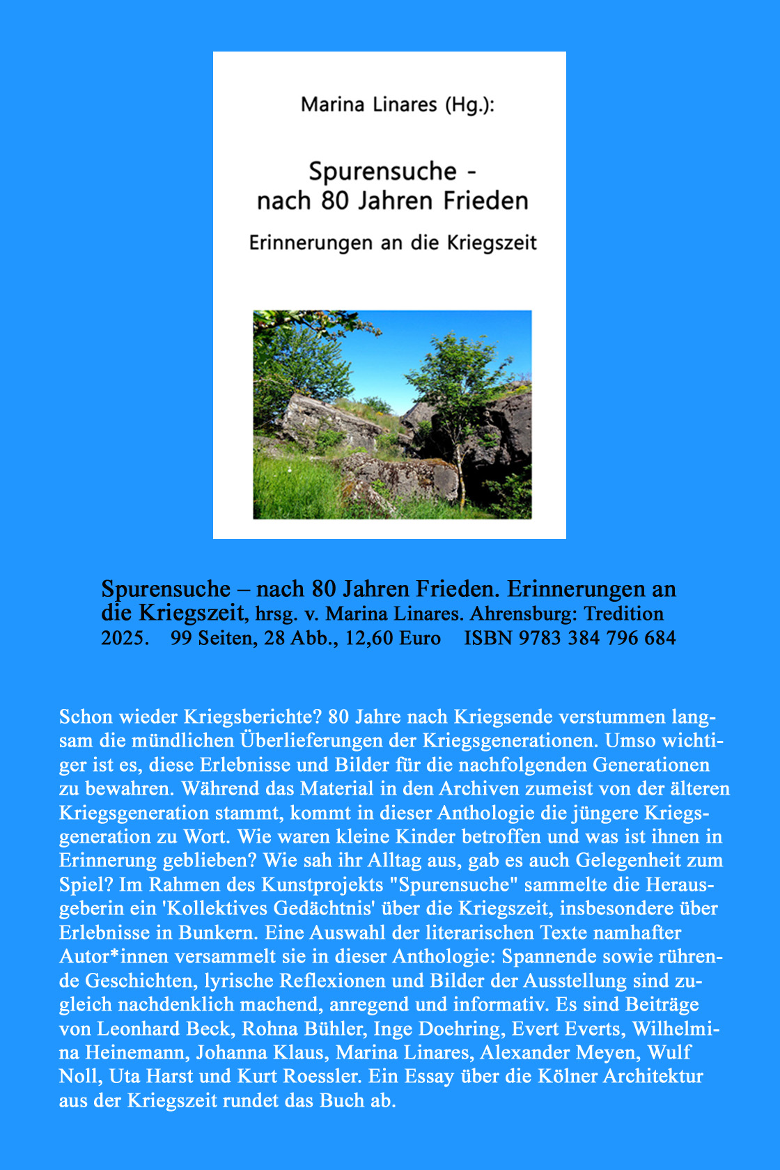 Marina Linares: "Never forget the Past!" Katalog zur Ausstellung 'Zwischen Vergessen und Erinnern'. Gedenkstätte 'bunkerk101', 28.05. – 12.06.2022. Köln: Art Projects, 2023.